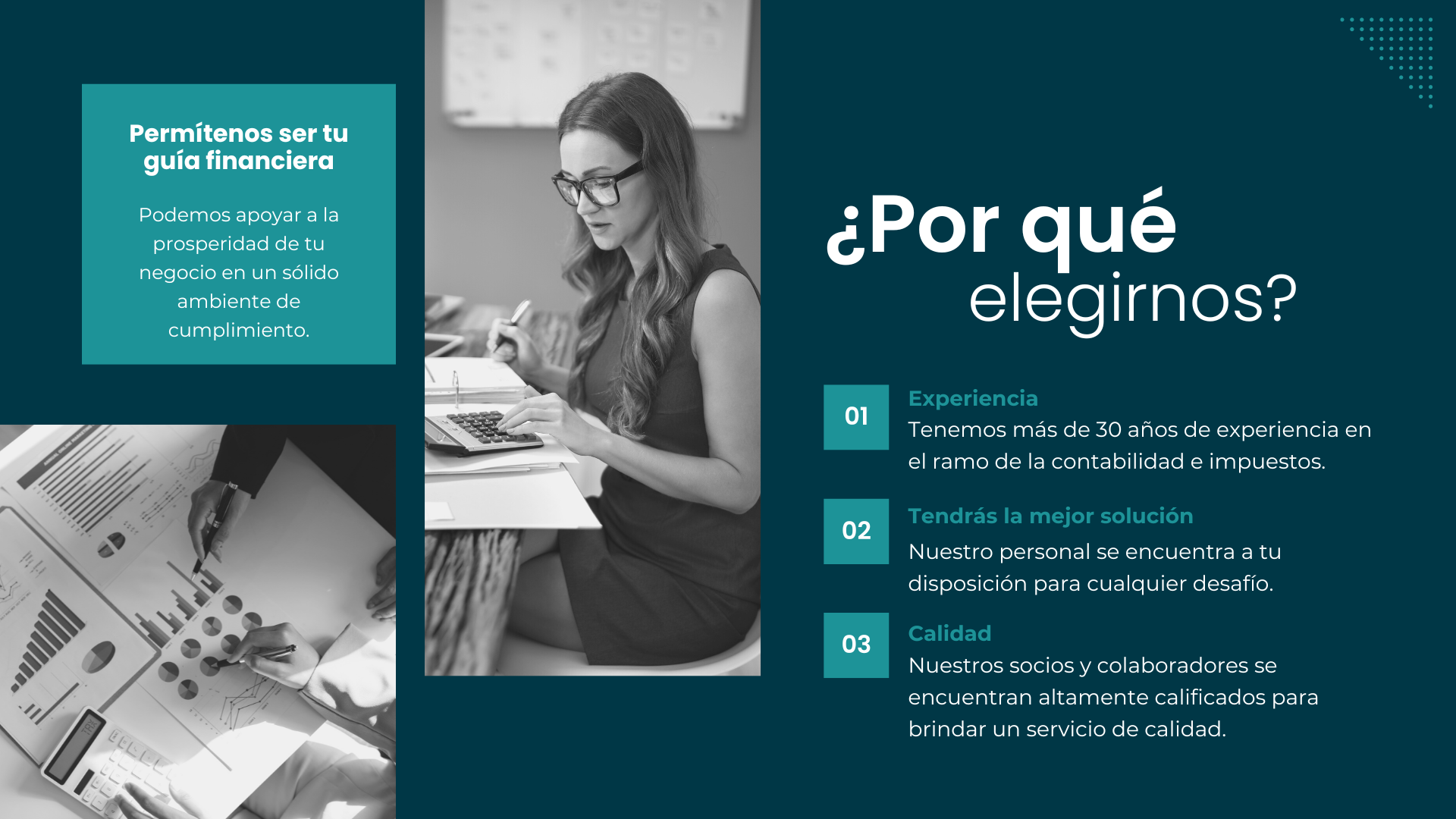 Somos una firma de contadores públicos certificados que trabaja en conjunto desde el año de 1989 en la ciudad de Tijuana, Baja California, México aplicando nuestro conocimiento, experiencia y creatividad para resolver los desafíos de cada uno de nuestros clientes, todo esto lo logramos en conjunto de personal ético y altamente calificado.